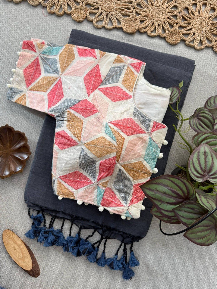 Grey Khadi Cotton Saree With Embrodery Work Stitched Blouse