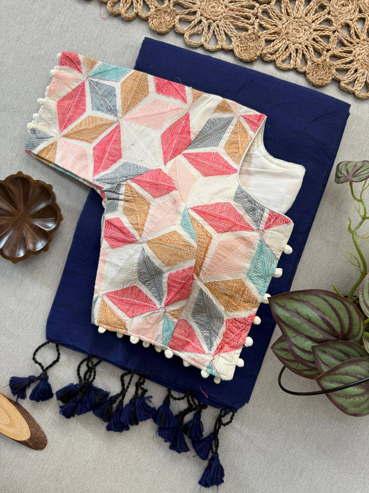 Drape yourself in tradition with this stunning ensemble featuring a pure handloom cotton saree, paired with a stitch khadi cotton blouse adorned with intricate work. The handmade latkan adds a delicate touch, making this outfit perfect for special occasion.