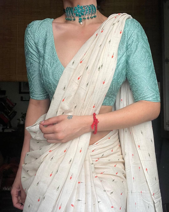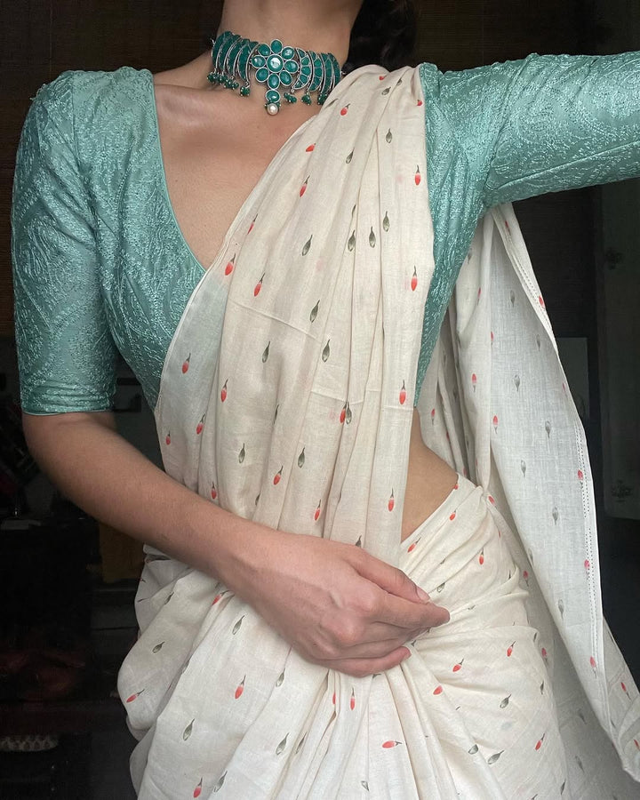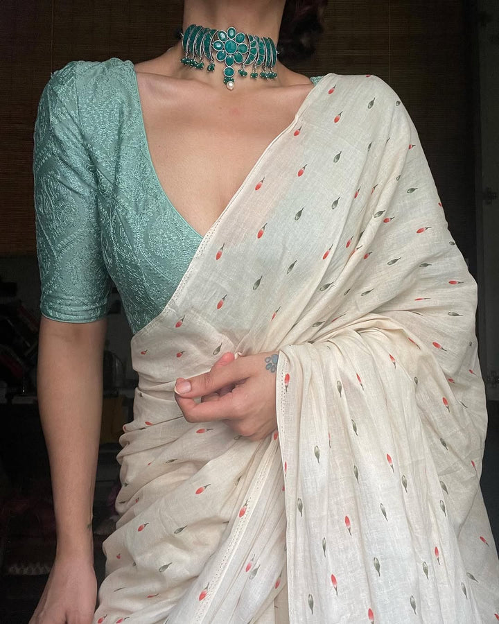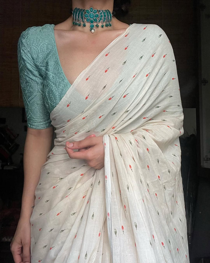 OFF WHITE LINEN PRINTED SAREE