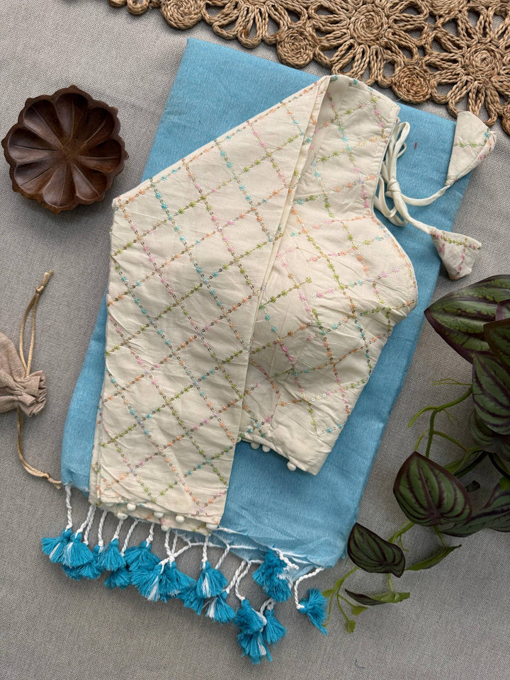 Sky Khadi Cotton Saree With Embrodery Work Stitched Blouse